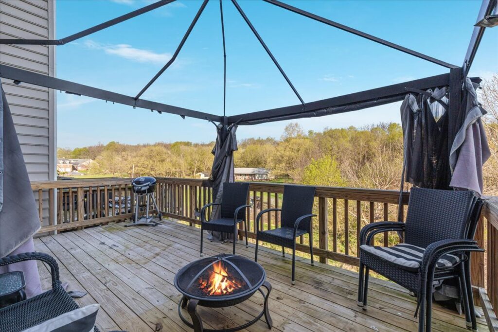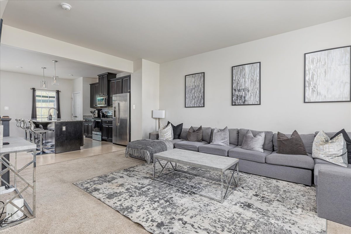 The entry level features a spacious living room and a half bath off the foyer. The kitchen and dining area impress with granite countertops, a large island with pendant lighting, stainless steel appliances, and a pantry. Step through the French door to your deck, a great spot to unwind.