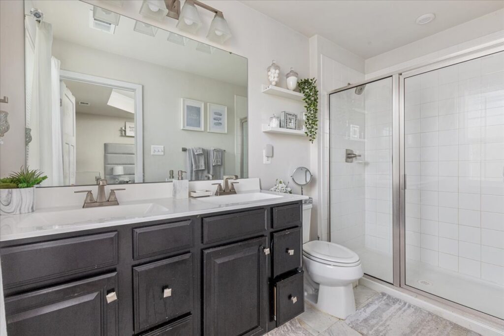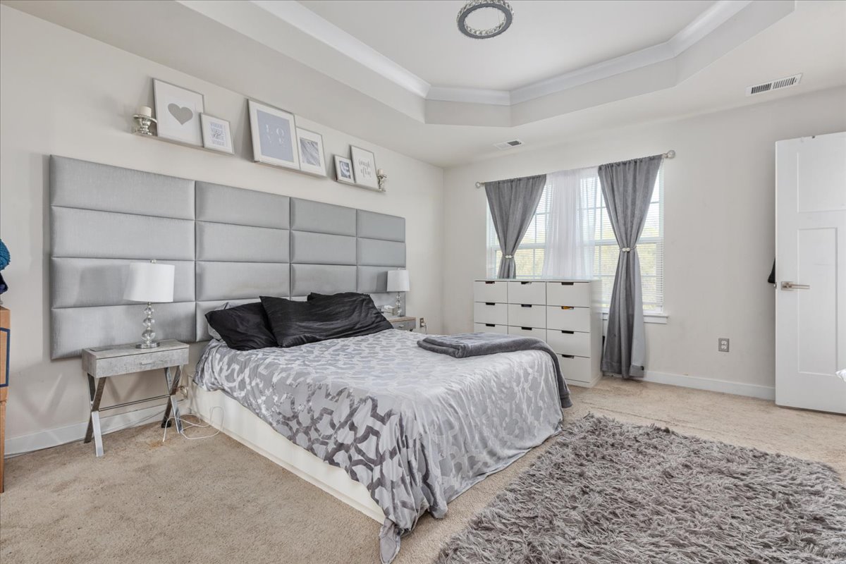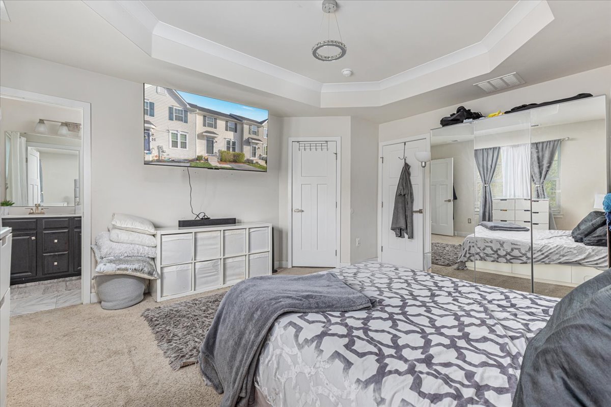 The upper level offers a primary bedroom with tray ceilings, a walk-in closet, and an en-suite bath featuring a tile shower with dual shower heads and double sinks. Two additional bedrooms, a full bath, and a laundry area round out this level.